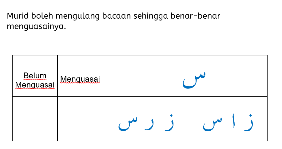 Pada ruangan “Belum Menguasai” pula, boleh dibuat catatan sebagai panduan pengulangan pada masa akan datang.