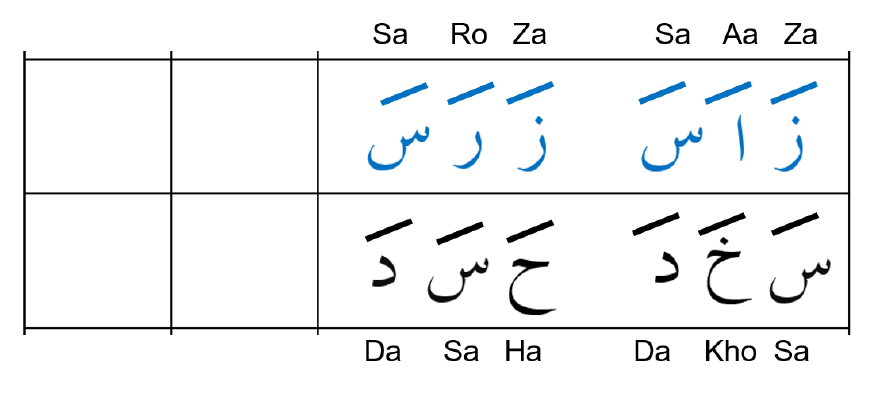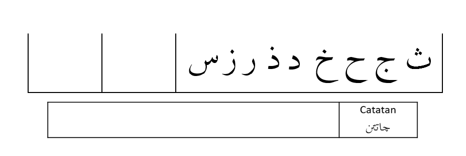 Dengan susunan yang sama dengan buku Iqra’ 1 dan dihilangkan barisnya, murid akan membaca huruf jawi tunggal satu persatu mengikut susunan yang diberikan.